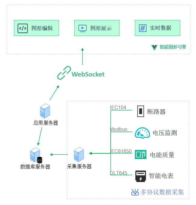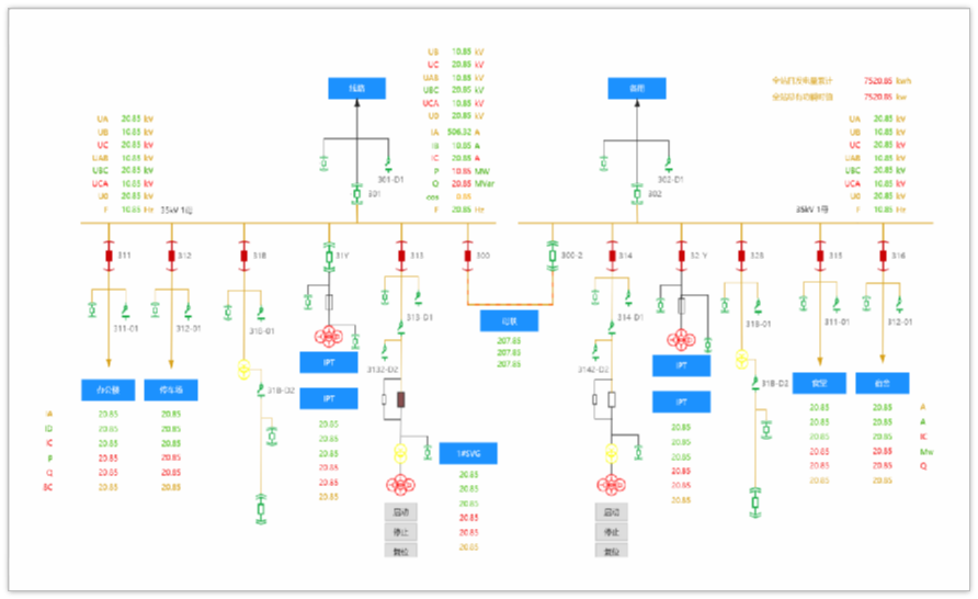 配电园区Scada系统提供丰富模板,组件式设计,插件式开发,帮助企业快速构建自己的电力能源接线图。结合websocket技术,实现数据的动态加载与实时展示。